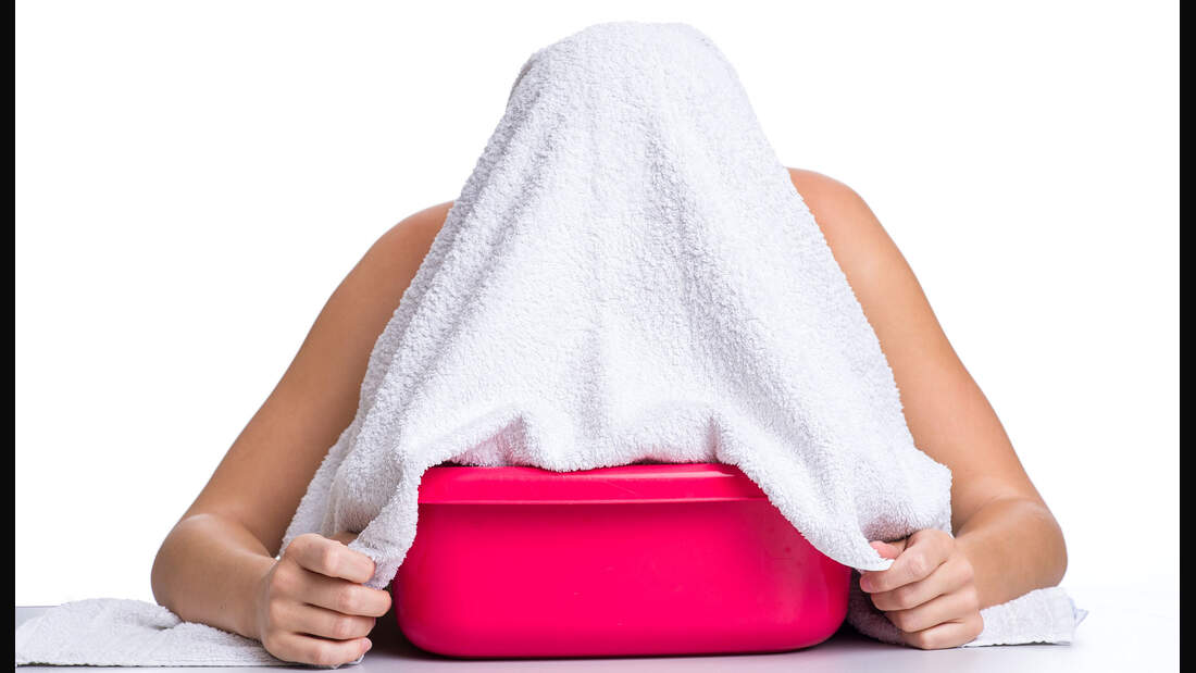Inhalieren mit Salz oder Kamillenblüten: Im Kampf gegen eine verstopfte Nase eignen sich am besten Salzwasserdampf oder Kamille. Dafür bringst du 2 Liter Wasser zum Kochen und füllst es zusammen mit drei Esslöffeln Salz oder einer Hand voll Kamillenblüten in eine große Schüssel. Kopf darüber halten und mit einem großen Handtuch gut abdecken. Dann 10 Minuten tief durch die Nase ein- und wieder ausatmen.